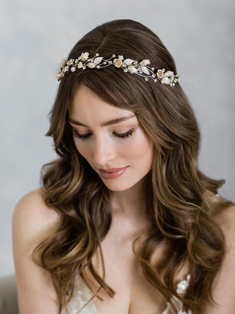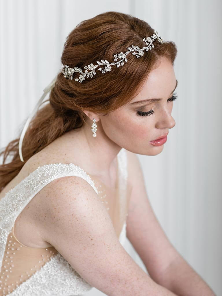 Tie headband of sparkling rhinestone, crystal, and metal flowers.