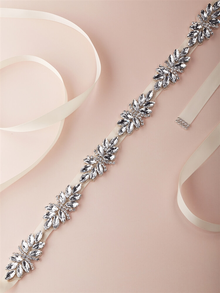Crystal Marquis Clusters Silver Bridal Belt with Ivory Ribbon