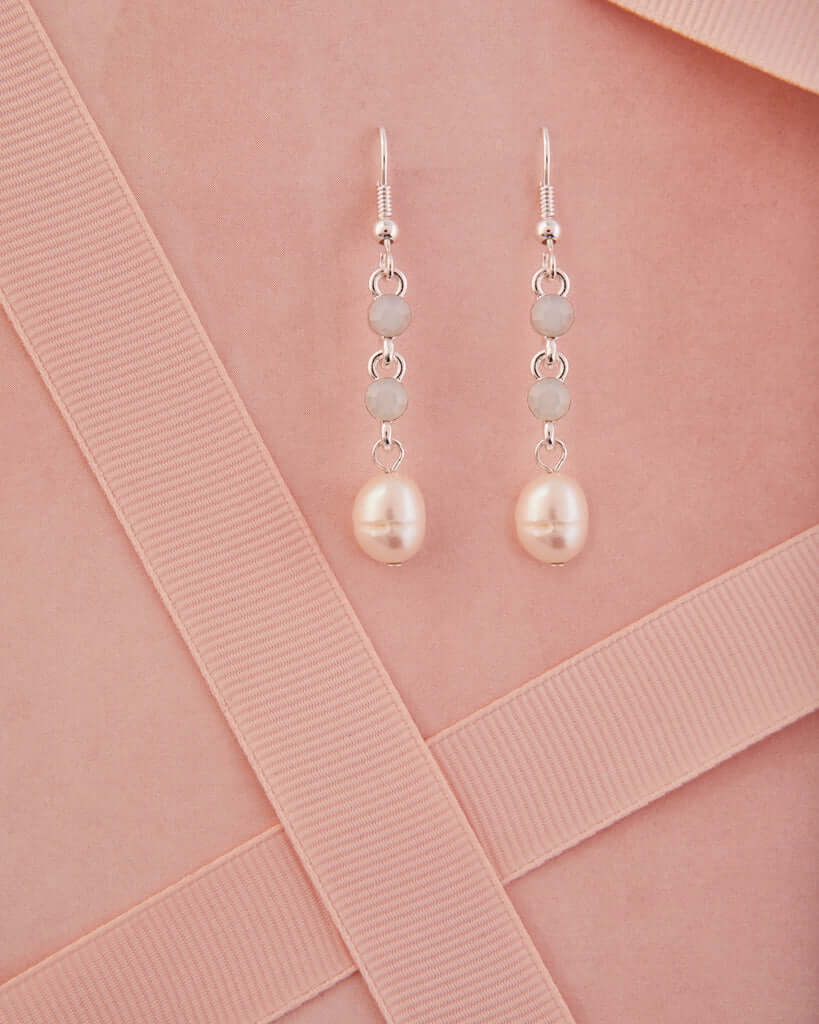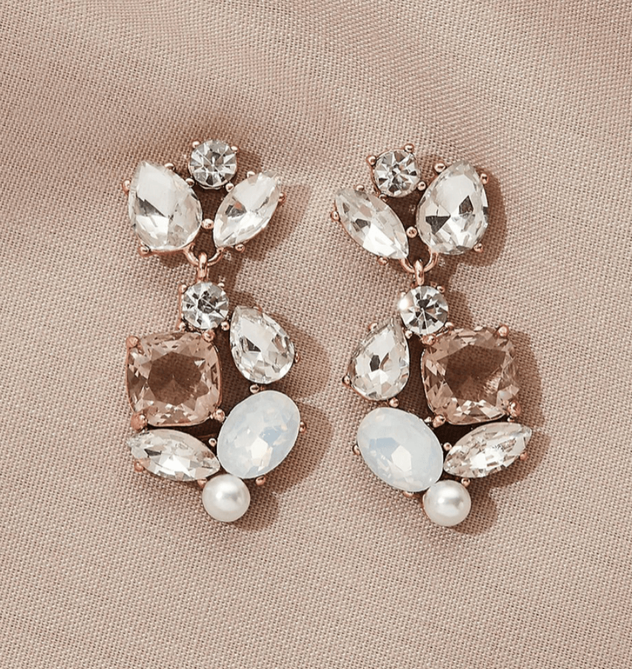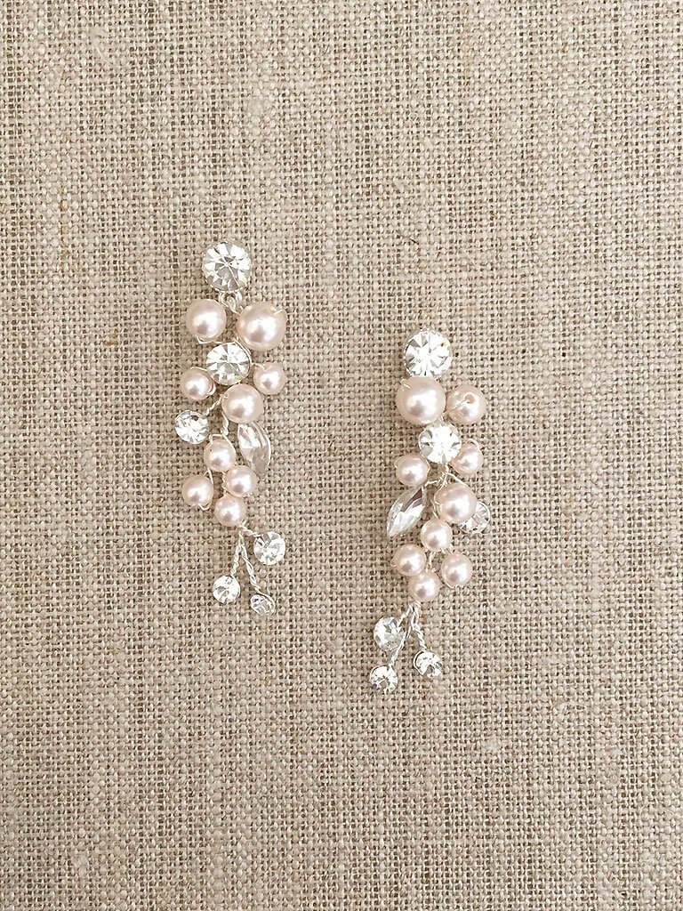 Romantic earrings of clusters of champagne pearls with rhinestone accents (available in silver or rose gold)