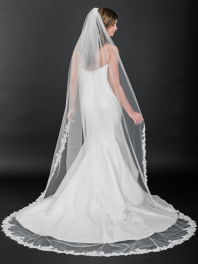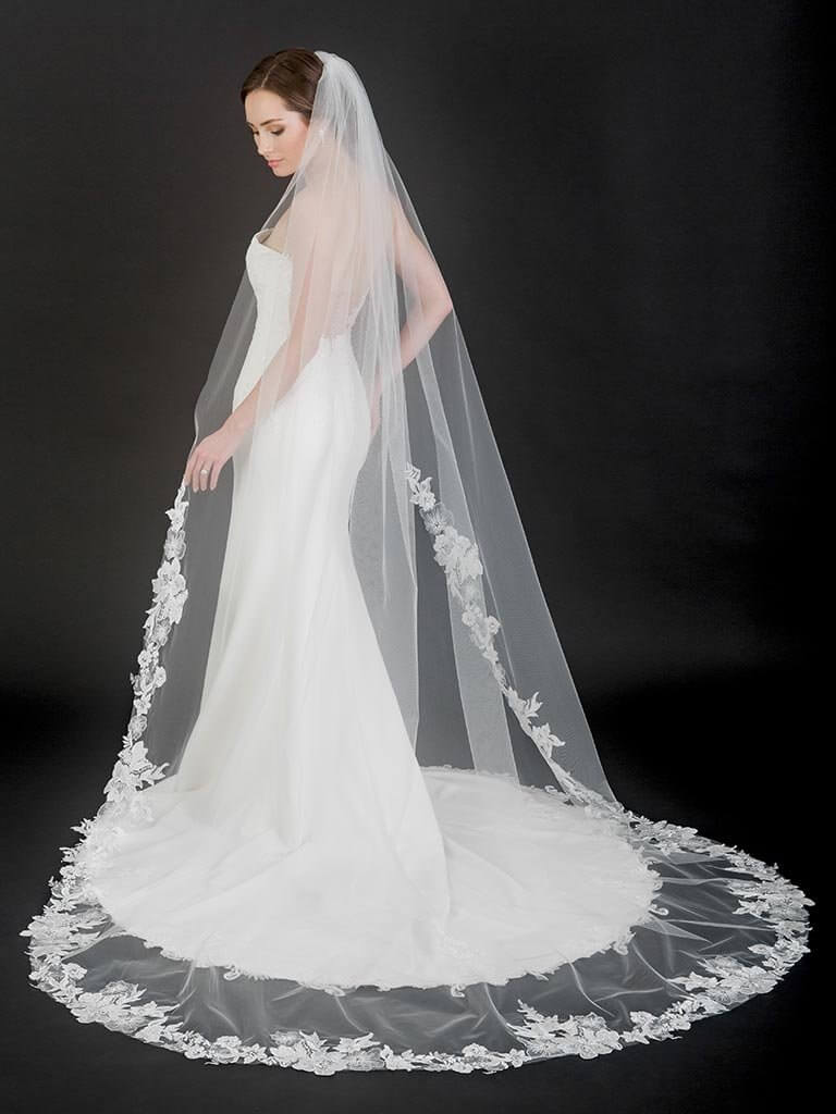 1-tier cut edge cathedral veil with dramatic floral lace accented with sequins.