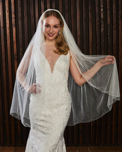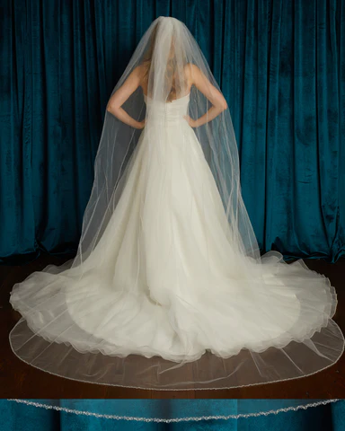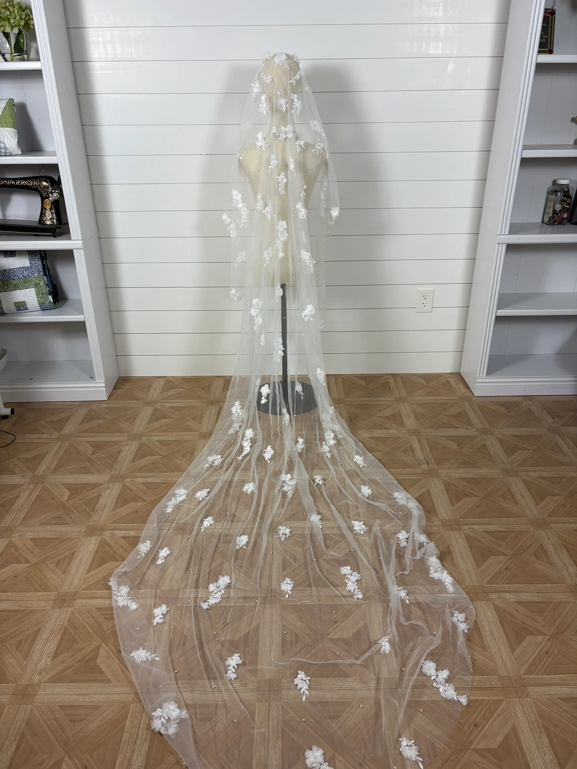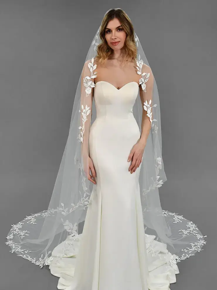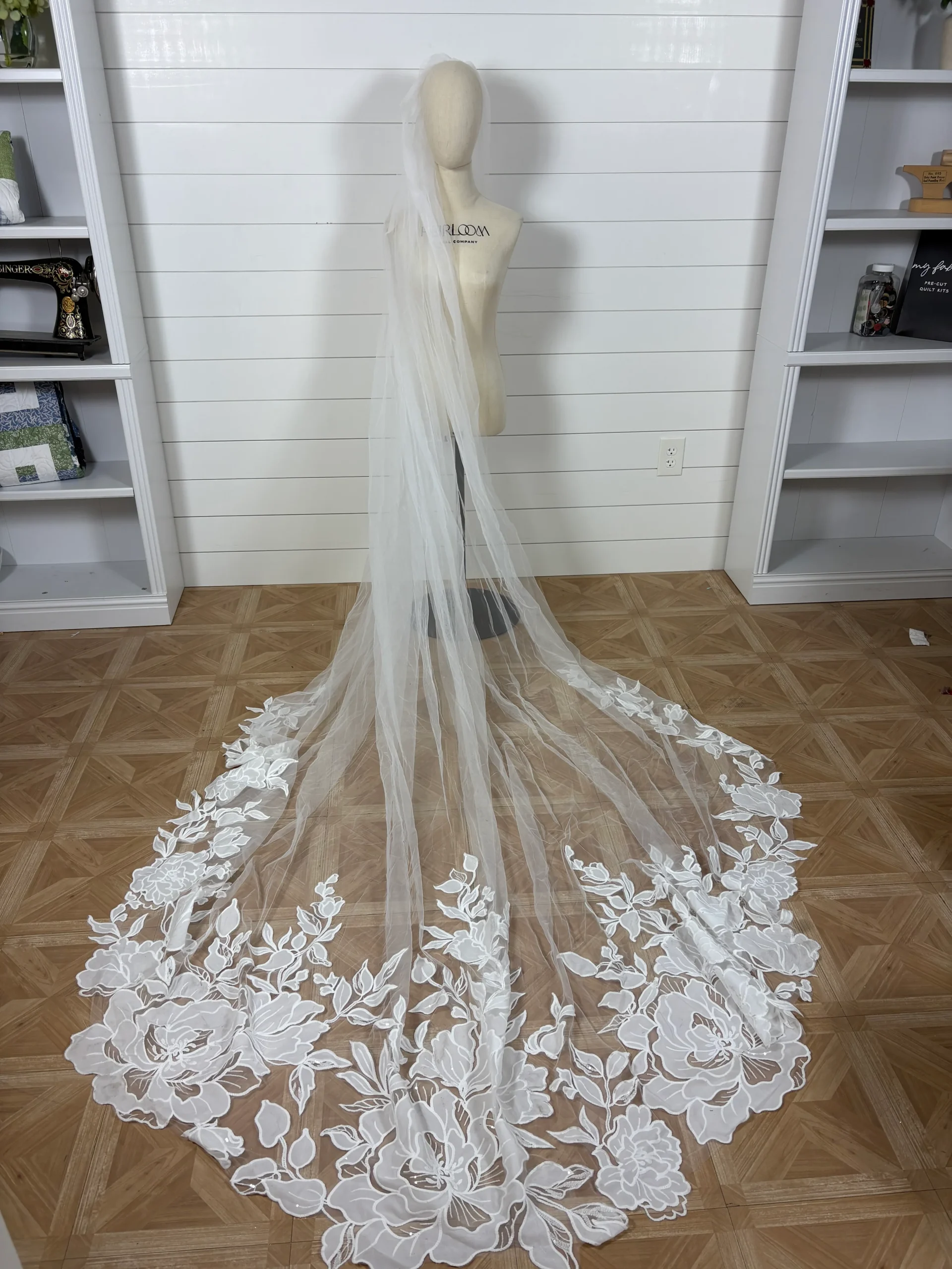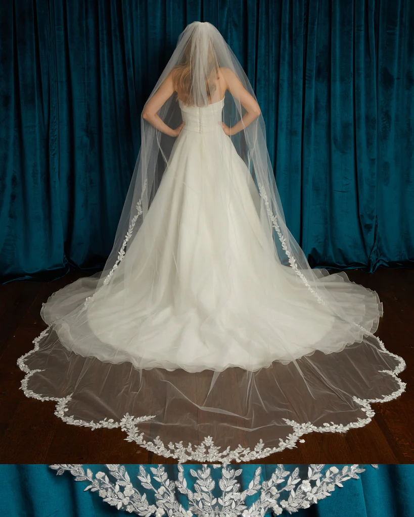 1-tier cathedral veil with floral lace appliqués accented with sequins